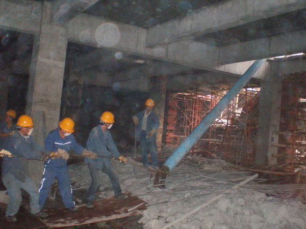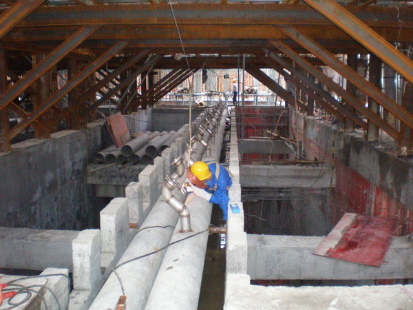 針對作業(yè)面在地下負二層,光線較差、通風不暢,同時土建單位正在拆除臨時支撐,施工現(xiàn)場工作環(huán)境相當惡劣等情況。為保證現(xiàn)場施工正常有序的進行和施工人員身體健康,項目部采取相應(yīng)措施保證了整個現(xiàn)場的安全、照明、通風。施工人員發(fā)揚四化建吃苦耐勞、敢打敢拼的精神,長期冒雨作業(yè)。吊裝中有吊機運行不到的地方,就積極開動腦筋,用技巧、經(jīng)驗和人力,保證前期設(shè)備及管道的吊裝倒運,為后期的施工做好了良好的鋪墊。
