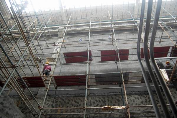 京溪污水工程系全地下施工,土建還有許多工作要同時做,拆摸、拆支撐架、拆臨時混凝土柱、砌墻、裝飾等,安裝在此交叉施工環(huán)境中進(jìn)行,噪音、灰塵、潮濕、陰暗、悶熱、不通風(fēng)、空間狹小。同時,交叉點多,安全要求高。只要有一個工作面,除了我們和土建,還有其他單位人員也要同時進(jìn)行,消防、照明、通風(fēng)、起重等,兩層地下室,每一層8-10米高,還有小型運料車輛進(jìn)入。里面全是人,腳手架、孔洞,安全要求太大。而且,材料、設(shè)備搬運、吊裝困難。只有一個進(jìn)出口,大的設(shè)備、材料要從吊裝口吊入,再通過自己因勢利導(dǎo)想的現(xiàn)場辦法才能運、移、吊裝到位。在里面吊車不能進(jìn),柱、梁也多,全靠人。有時一臺設(shè)備吊進(jìn)去搬運安裝到位得要2天。