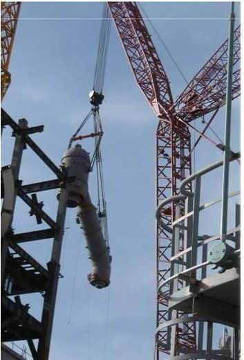 該氣化爐由西安熱工研究院自主研發(fā)設(shè)計(jì)、杭州鍋爐公司制造,系中國(guó)自主知識(shí)產(chǎn)權(quán)的首臺(tái)示范爐。其爐體總重600多噸,分上下兩段吊裝,上午10點(diǎn),現(xiàn)場(chǎng)啟用1250噸履帶式起重機(jī)起吊,吊裝高度38米,整個(gè)吊裝不到1小時(shí),就將氣化爐的300多噸上段部分與框架內(nèi)的下段部分穩(wěn)妥就位。該爐的就位為配置附爐管線(xiàn)、加快施工進(jìn)度贏(yíng)得了時(shí)間。