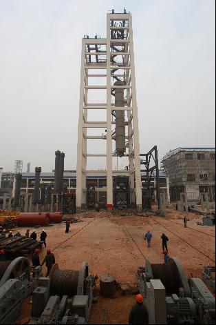 校正、對眼、插螺栓、緊固螺母、松鋼絲繩……2010年12月13日下午5點,隨著最后一顆螺帽的擰緊、固定,金象18·30氨合成塔成功吊裝就位,聲聲鞭炮陣陣禮花在寒風中歡快地歌唱。
