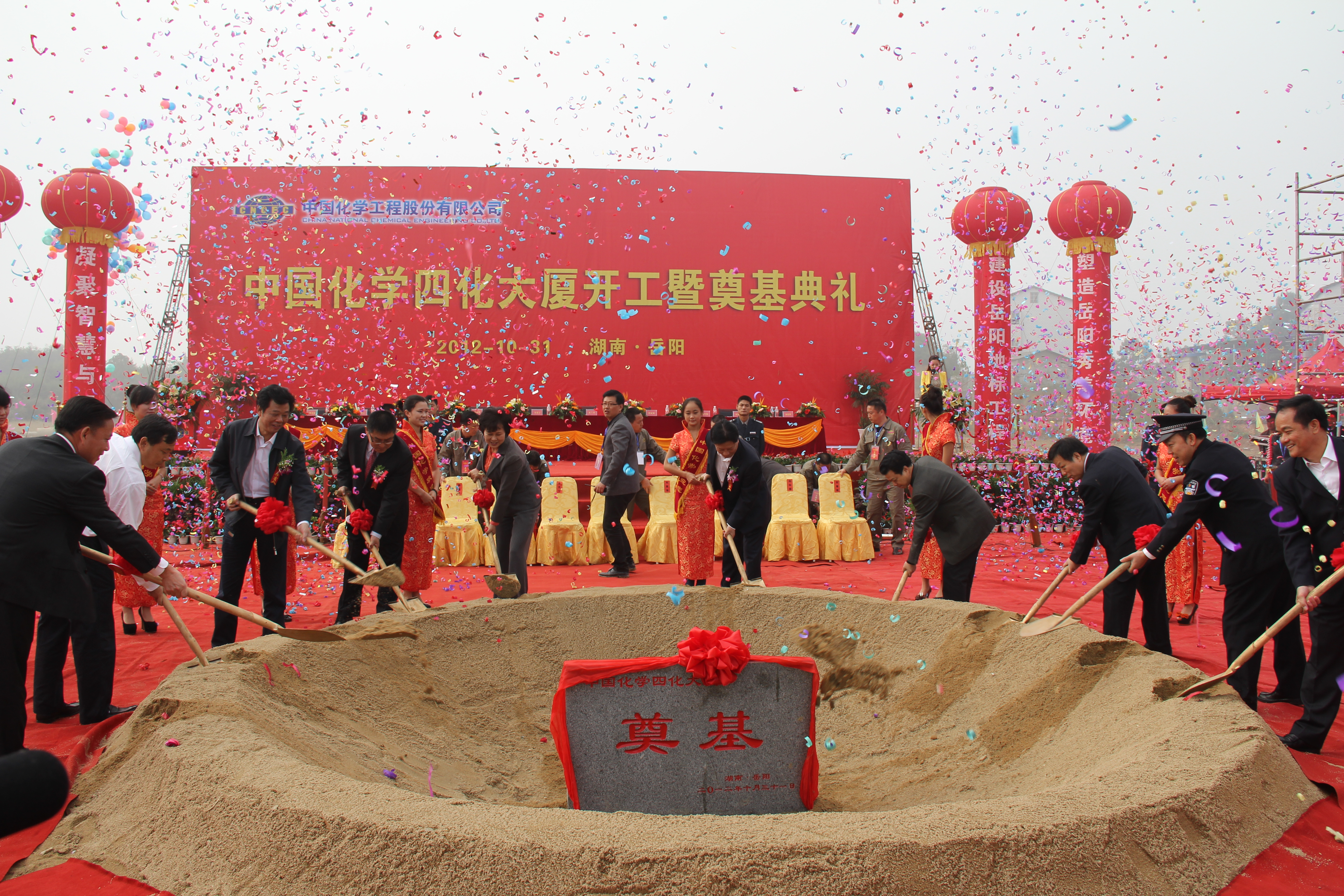 中國(guó)化學(xué)工程集團(tuán)公司黨委書(shū)記、總經(jīng)理、中國(guó)化學(xué)工程股份有限公司黨委書(shū)記、董事長(zhǎng)金克寧出席儀式。岳陽(yáng)市委書(shū)記黃蘭香宣布“中國(guó)化學(xué)四化大廈開(kāi)工”。岳陽(yáng)市委副書(shū)記、市長(zhǎng)盛榮華,中國(guó)化學(xué)工程股份有限公司黨委常委、副總經(jīng)理劉家強(qiáng),岳陽(yáng)市經(jīng)濟(jì)技術(shù)開(kāi)發(fā)區(qū)工委書(shū)記胡知榮,公司黨委書(shū)記、董事長(zhǎng)劉德輝等先后在儀式上致辭。岳陽(yáng)市委常委、市委秘書(shū)長(zhǎng)樊進(jìn)軍,岳陽(yáng)市委常委、副市長(zhǎng)陳四海,岳陽(yáng)市政府副廳級(jí)干部、市公安局局長(zhǎng)丁陽(yáng)云共同出席儀式,并為四化大廈鏟土奠基。開(kāi)工奠基儀式由岳陽(yáng)市經(jīng)濟(jì)技術(shù)開(kāi)發(fā)區(qū)工委副書(shū)記、管委會(huì)主任劉美樹(shù)主持。