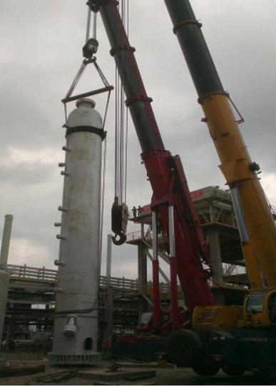 彩云之南寬廣湛藍(lán)的天空下,云南先鋒化工有限公司12萬噸/年寬餾分煤焦油加氫改質(zhì)工程工藝設(shè)備安裝項目的一、二、三級反應(yīng)器共3臺設(shè)備高高地矗立在施工現(xiàn)場。安裝制造分公司云南先鋒項目部的施工人員終于長長地吁了一口氣,心情激動又自豪??偘鼏挝还こ處煹哪樕弦猜冻隽诵θ荨?br />  這樣的笑容來之不易。3臺反應(yīng)器,最高的有19米多,單臺重量最大達(dá)到141余噸??偘鼏挝辉谠O(shè)計的時候未考慮吊耳。由于材質(zhì)特殊,也無法在設(shè)備上施焊增加吊耳,這是最棘手的。總包單位束手無策,但又不同意項目部提出采用鋼絲繩捆綁式的吊裝方案,猶豫著不愿意簽字,萬一有個失誤,后果不堪設(shè)想!