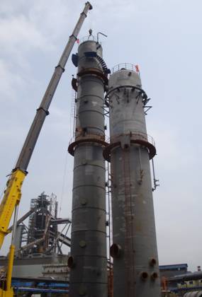 4月12日早上7點,項目部管理人員到達現(xiàn)場開始準備。7點30分,200噸吊車進入現(xiàn)場,韶鋼項目經(jīng)理王建民來到現(xiàn)場進行指揮。首先吊裝的是高27米、重18.5噸的脫苯塔。上午9點整,脫苯塔順利安裝完成。吊車開始移位,準備吊裝高12米(總高31米)、重18噸的終冷塔上節(jié)。上午11點,終冷塔上節(jié)開始組對焊接。1個多小時后,吊車順利脫鉤,終冷塔順利安裝完成。